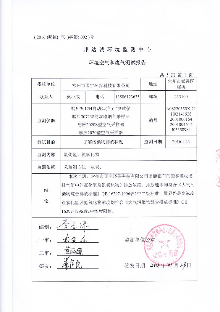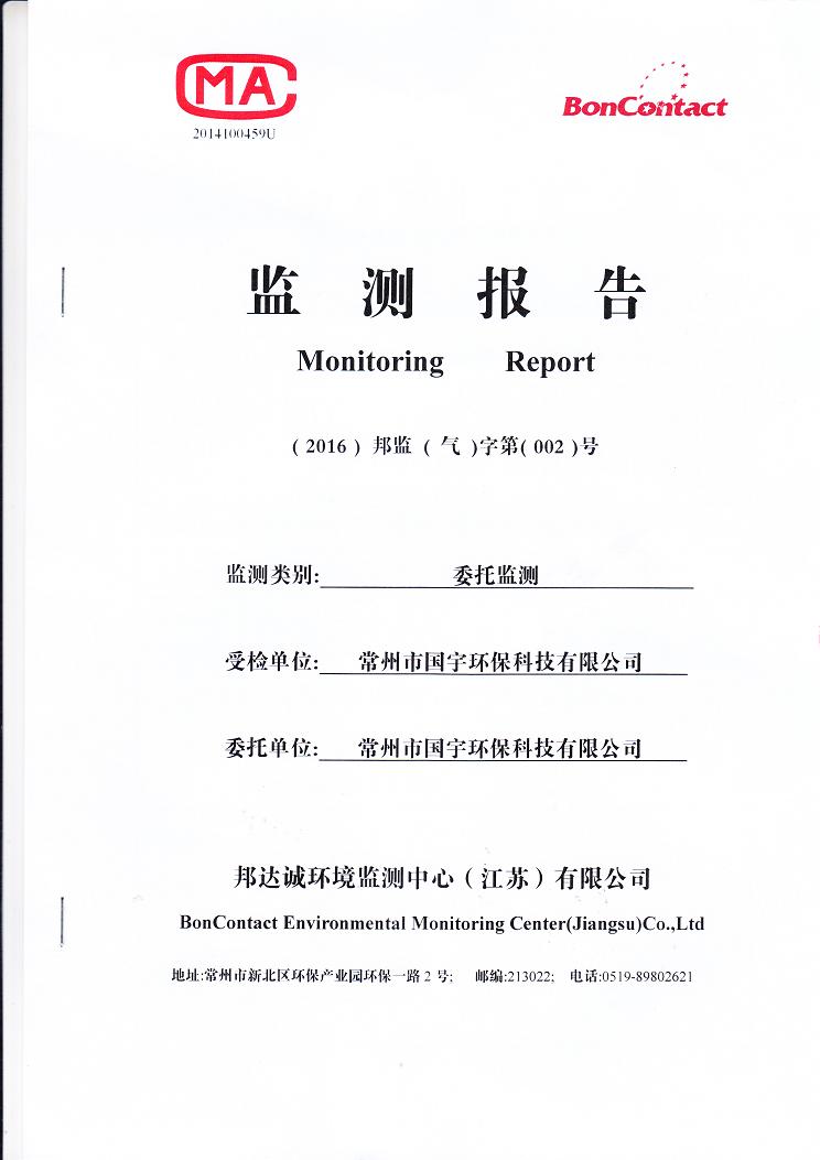 2016年常州市國(guó)宇環(huán)保科技有限公司氣監(jiān)測(cè)報(bào)告網(wǎng)上公示