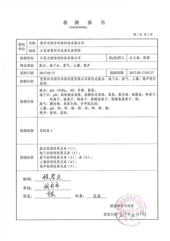 2016年常州市國宇環保科技有限公司氣監測報告網上公示