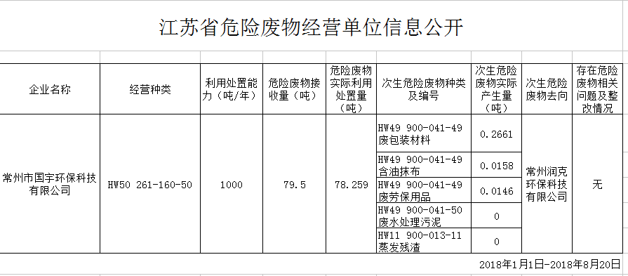 常州市國宇環保科技有限公司江蘇省危險廢物經營單位信息公開